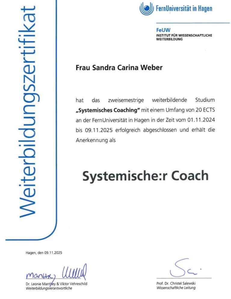Im November 2025 habe ich meine Weiterbildung zur Zertifizierten Systemischen Coach an der FernUni Hagen abgeschlossen, die mich in meinem Denken und Handeln bereichert, stärkt und inspiriert hat.